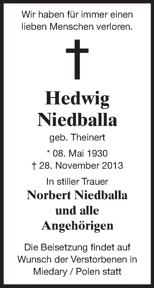 Hier finden Sie alle Traueranzeigen aus der Zeitung, die bisher für Hedwig Niedballa erschienen sind. Weitere Traueranzeigen, die in der Zeitung erscheinen, werden hier ebenfalls aufgelistet