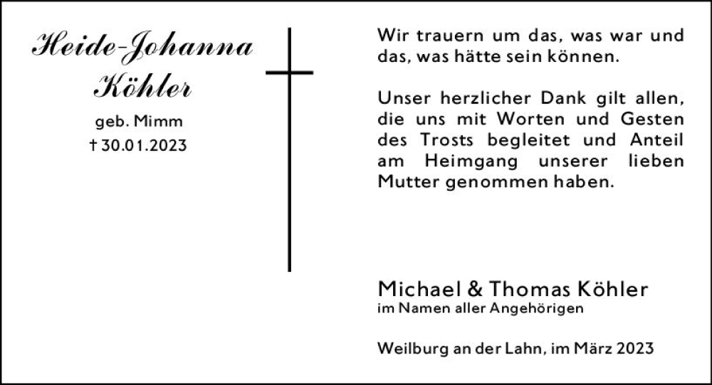 Hier finden Sie alle Traueranzeigen aus der Zeitung, die bisher für Heide-Johanna Köhler erschienen sind. Weitere Traueranzeigen, die in der Zeitung erscheinen, werden hier ebenfalls aufgelistet