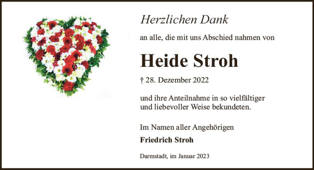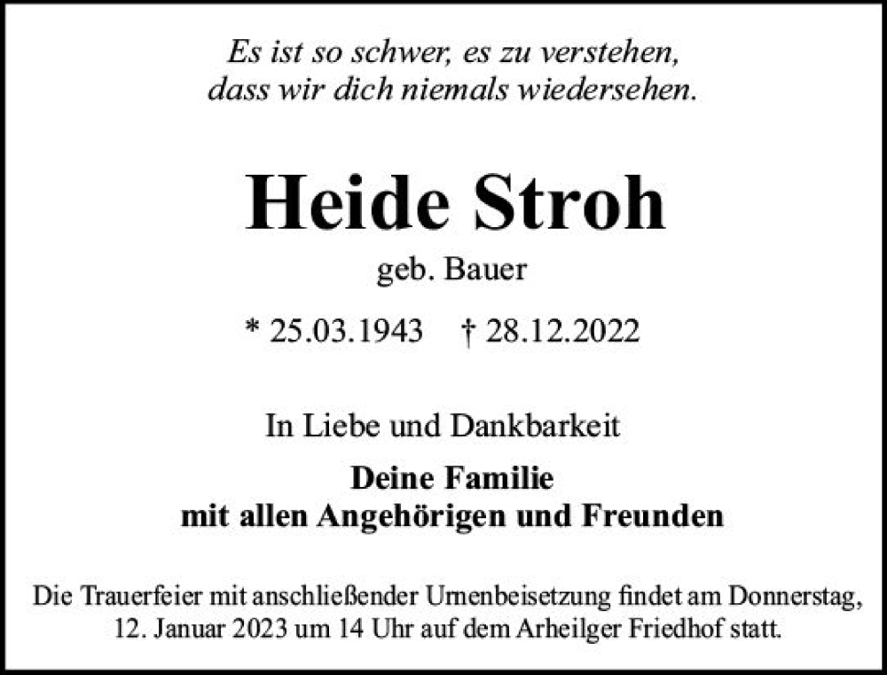 Hier finden Sie alle Traueranzeigen aus der Zeitung, die bisher für Heide Stroh erschienen sind. Weitere Traueranzeigen, die in der Zeitung erscheinen, werden hier ebenfalls aufgelistet