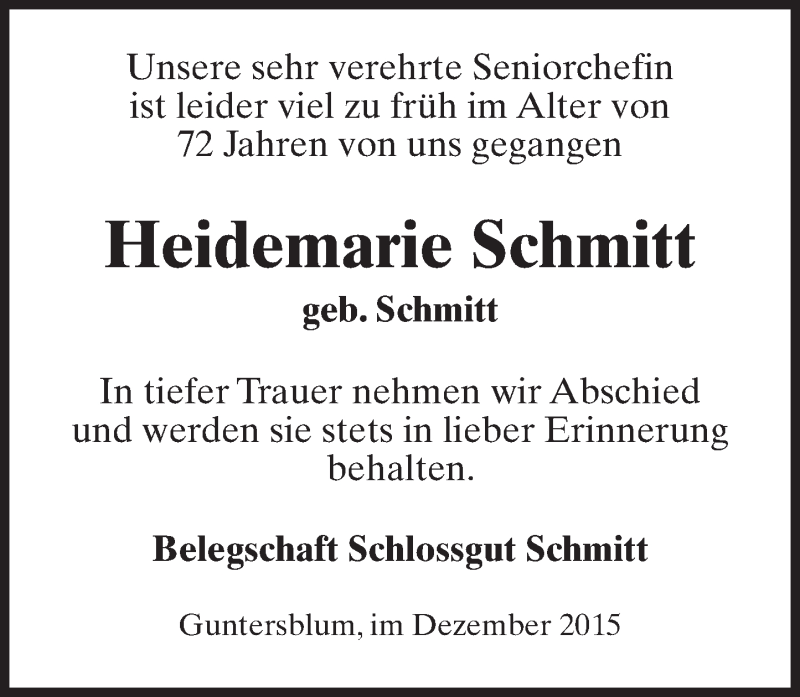 Hier finden Sie alle Traueranzeigen aus der Zeitung, die bisher für Heidemarie Schmitt erschienen sind. Weitere Traueranzeigen, die in der Zeitung erscheinen, werden hier ebenfalls aufgelistet