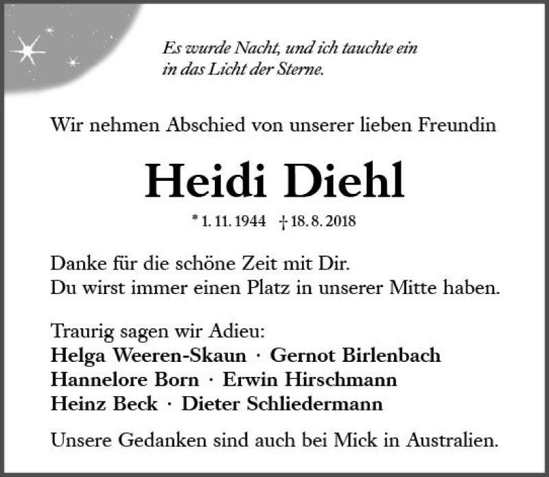 Hier finden Sie alle Traueranzeigen aus der Zeitung, die bisher für Heidi Diehl erschienen sind. Weitere Traueranzeigen, die in der Zeitung erscheinen, werden hier ebenfalls aufgelistet