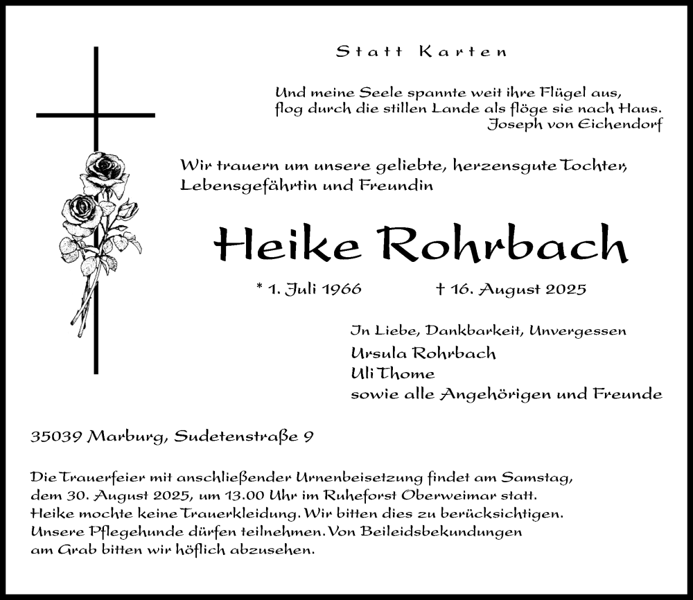 Hier finden Sie alle Traueranzeigen aus der Zeitung, die bisher für Heike Rohrbach erschienen sind. Weitere Traueranzeigen, die in der Zeitung erscheinen, werden hier ebenfalls aufgelistet