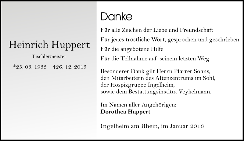 Hier finden Sie alle Traueranzeigen aus der Zeitung, die bisher für Heinrich Huppert erschienen sind. Weitere Traueranzeigen, die in der Zeitung erscheinen, werden hier ebenfalls aufgelistet