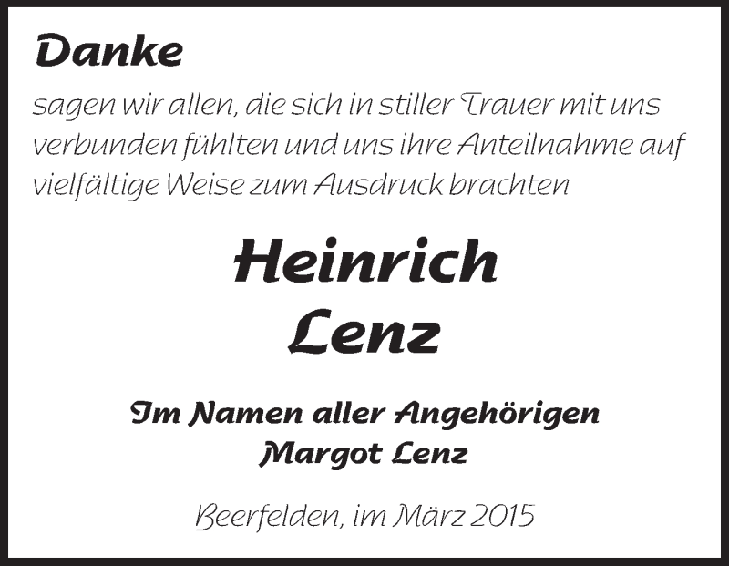 Hier finden Sie alle Traueranzeigen aus der Zeitung, die bisher für Heinrich Lenz erschienen sind. Weitere Traueranzeigen, die in der Zeitung erscheinen, werden hier ebenfalls aufgelistet