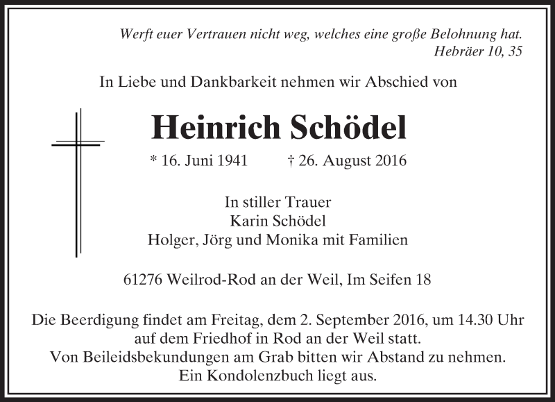 Hier finden Sie alle Traueranzeigen aus der Zeitung, die bisher für Heinrich Schödel erschienen sind. Weitere Traueranzeigen, die in der Zeitung erscheinen, werden hier ebenfalls aufgelistet