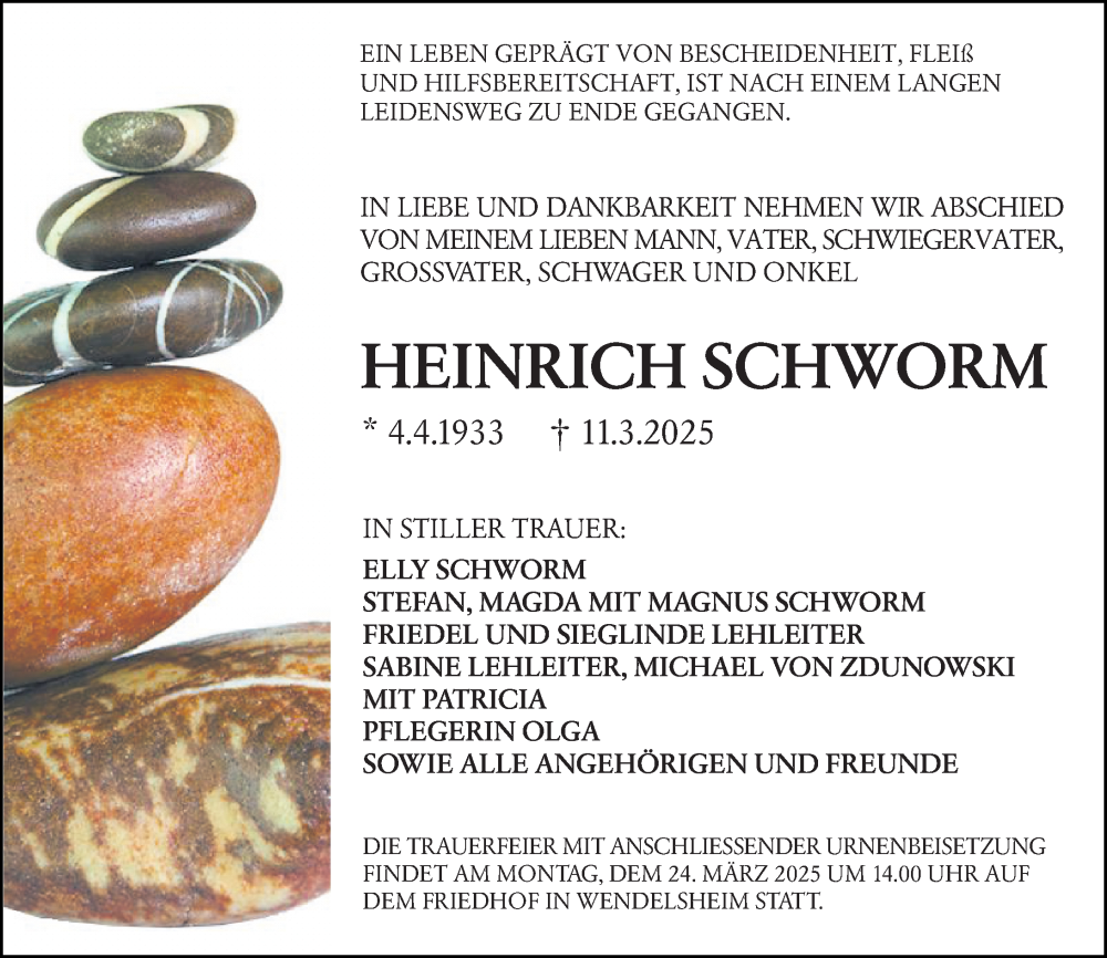 Hier finden Sie alle Traueranzeigen aus der Zeitung, die bisher für Heinrich Schworm erschienen sind. Weitere Traueranzeigen, die in der Zeitung erscheinen, werden hier ebenfalls aufgelistet