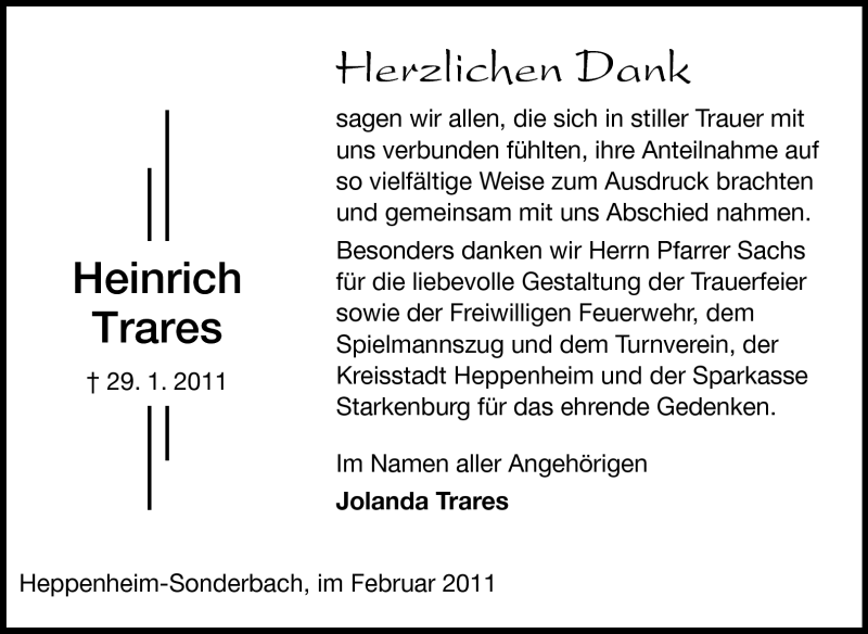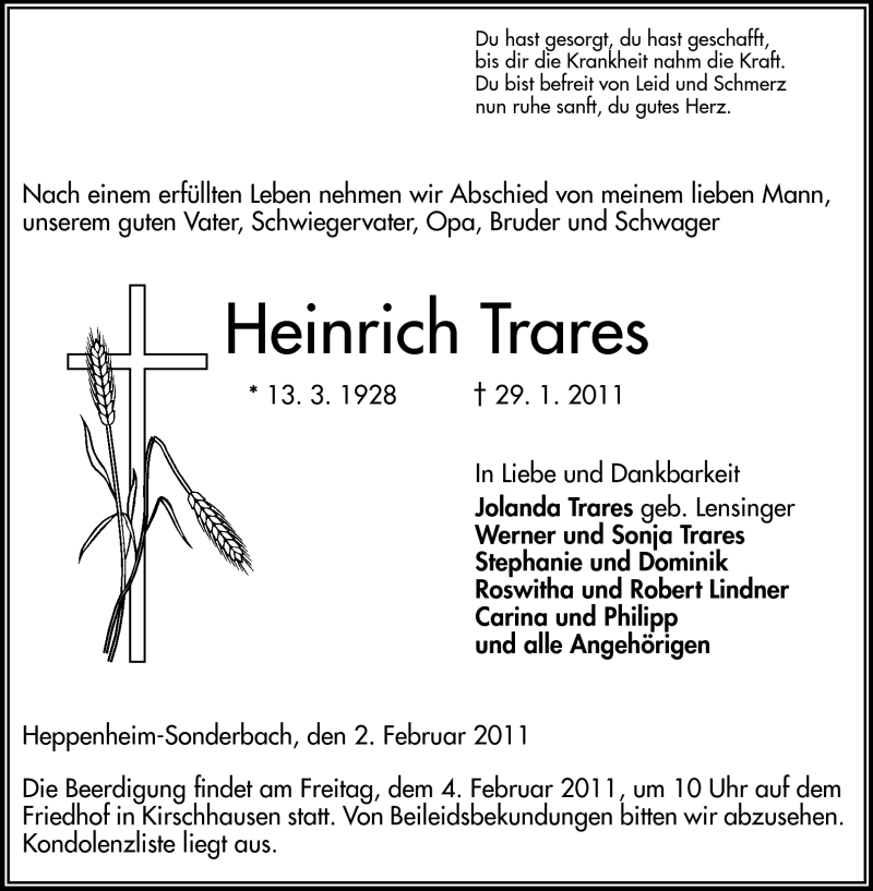 Hier finden Sie alle Traueranzeigen aus der Zeitung, die bisher für Heinrich Trares erschienen sind. Weitere Traueranzeigen, die in der Zeitung erscheinen, werden hier ebenfalls aufgelistet