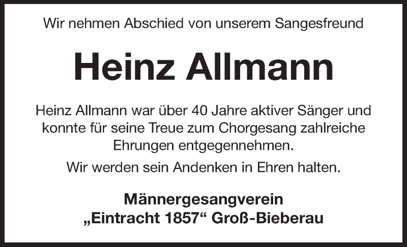 Hier finden Sie alle Traueranzeigen aus der Zeitung, die bisher für Heinz Allmann erschienen sind. Weitere Traueranzeigen, die in der Zeitung erscheinen, werden hier ebenfalls aufgelistet
