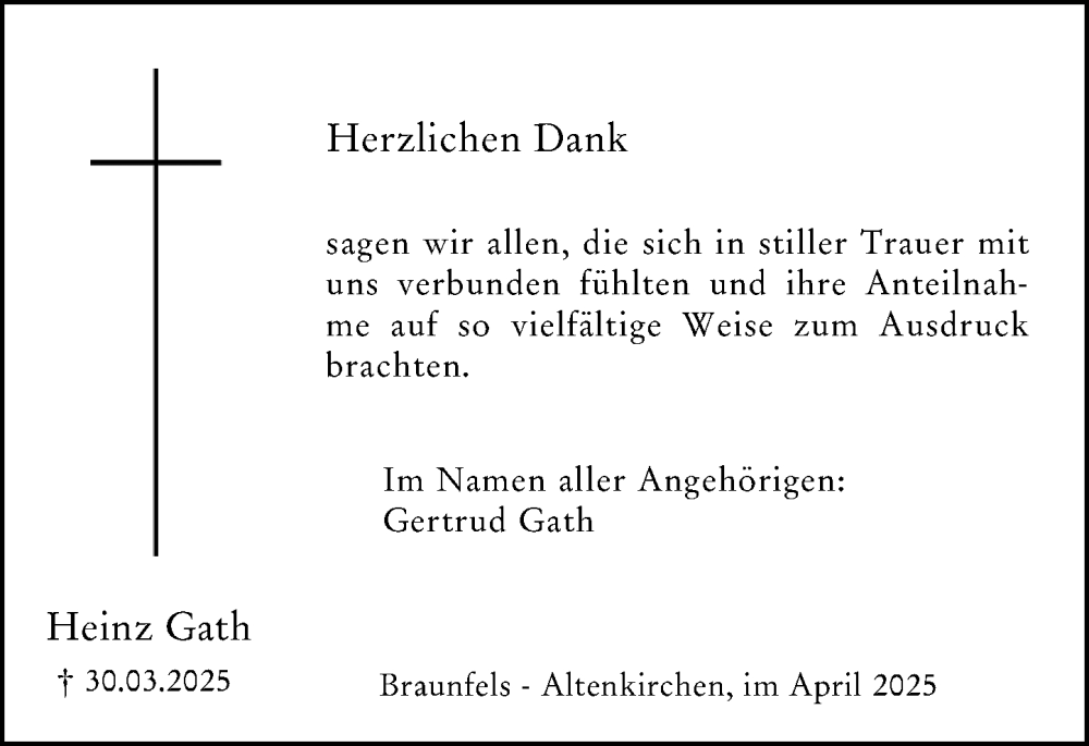 Hier finden Sie alle Traueranzeigen aus der Zeitung, die bisher für Heinz Gath erschienen sind. Weitere Traueranzeigen, die in der Zeitung erscheinen, werden hier ebenfalls aufgelistet