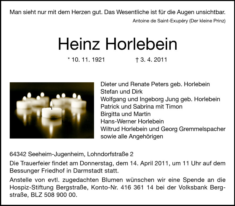 Hier finden Sie alle Traueranzeigen aus der Zeitung, die bisher für Heinz Horlebein erschienen sind. Weitere Traueranzeigen, die in der Zeitung erscheinen, werden hier ebenfalls aufgelistet
