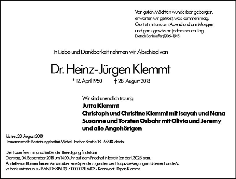 Hier finden Sie alle Traueranzeigen aus der Zeitung, die bisher für Heinz-Jürgen Klemmt erschienen sind. Weitere Traueranzeigen, die in der Zeitung erscheinen, werden hier ebenfalls aufgelistet