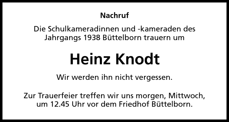 Hier finden Sie alle Traueranzeigen aus der Zeitung, die bisher für Heinz Knodt erschienen sind. Weitere Traueranzeigen, die in der Zeitung erscheinen, werden hier ebenfalls aufgelistet