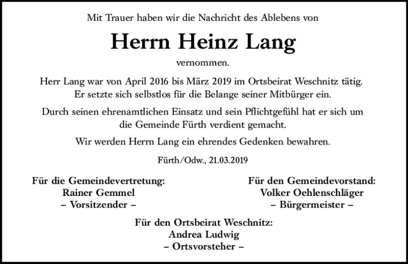 Hier finden Sie alle Traueranzeigen aus der Zeitung, die bisher für Heinz Lang erschienen sind. Weitere Traueranzeigen, die in der Zeitung erscheinen, werden hier ebenfalls aufgelistet