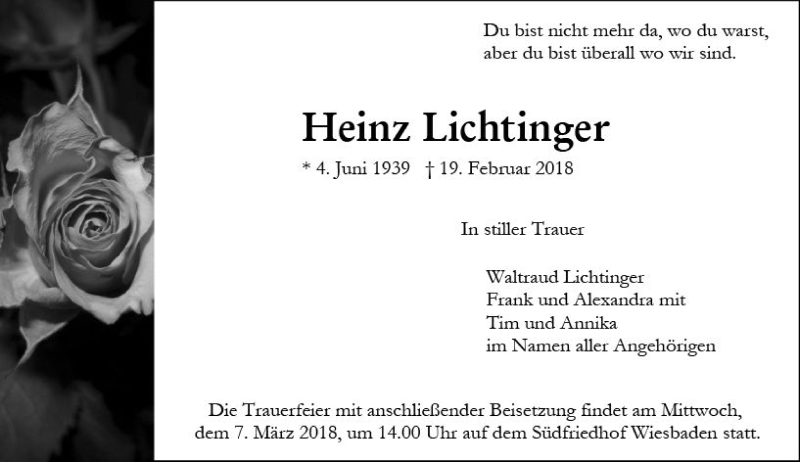 Hier finden Sie alle Traueranzeigen aus der Zeitung, die bisher für Heinz Lichtinger erschienen sind. Weitere Traueranzeigen, die in der Zeitung erscheinen, werden hier ebenfalls aufgelistet