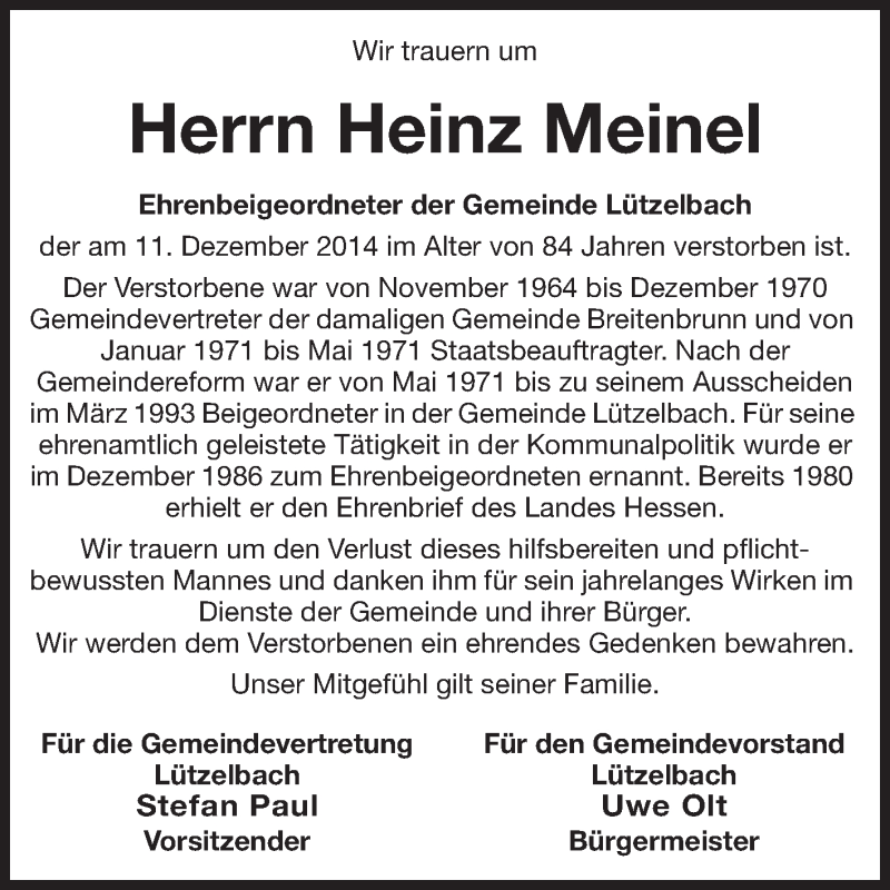 Hier finden Sie alle Traueranzeigen aus der Zeitung, die bisher für Heinz Meinel erschienen sind. Weitere Traueranzeigen, die in der Zeitung erscheinen, werden hier ebenfalls aufgelistet