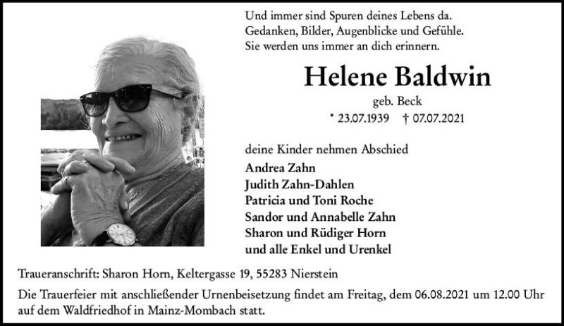 Hier finden Sie alle Traueranzeigen aus der Zeitung, die bisher für Helene Baldwin erschienen sind. Weitere Traueranzeigen, die in der Zeitung erscheinen, werden hier ebenfalls aufgelistet