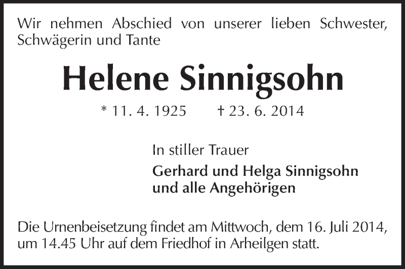 Hier finden Sie alle Traueranzeigen aus der Zeitung, die bisher für Helene Sinnigsohn erschienen sind. Weitere Traueranzeigen, die in der Zeitung erscheinen, werden hier ebenfalls aufgelistet