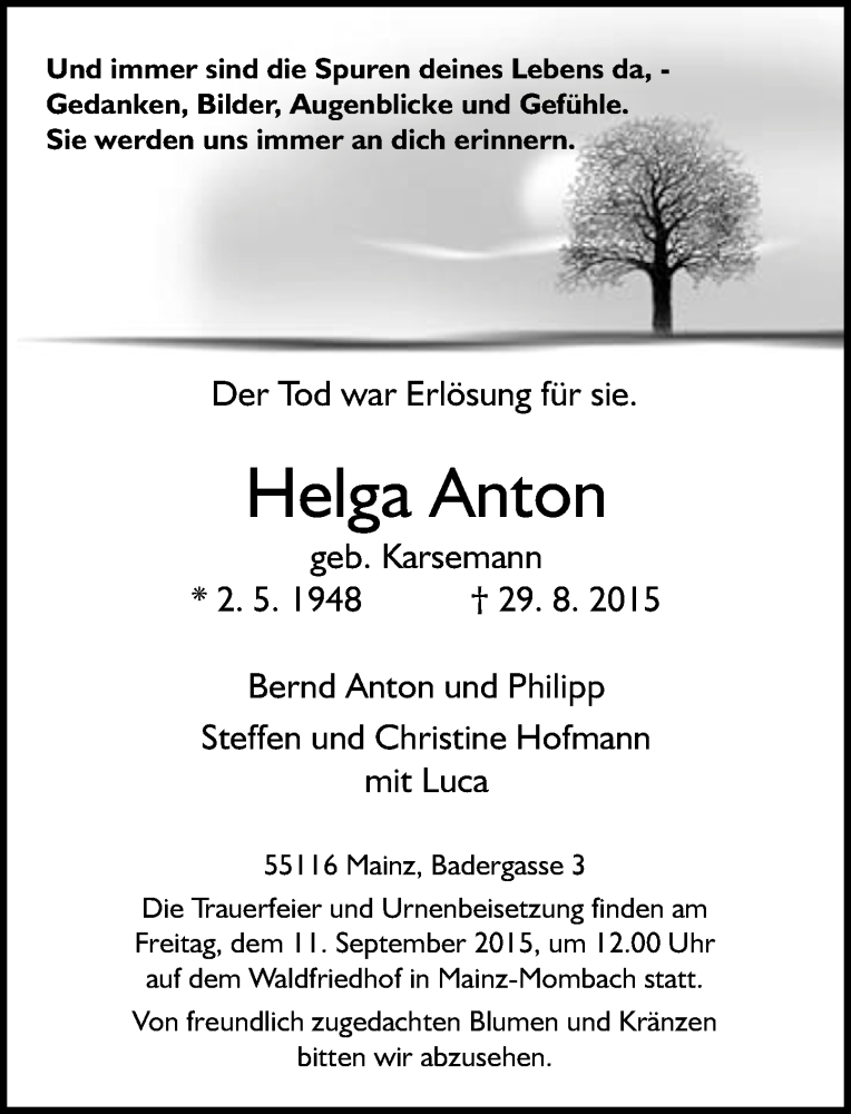 Hier finden Sie alle Traueranzeigen aus der Zeitung, die bisher für Helga Anton erschienen sind. Weitere Traueranzeigen, die in der Zeitung erscheinen, werden hier ebenfalls aufgelistet