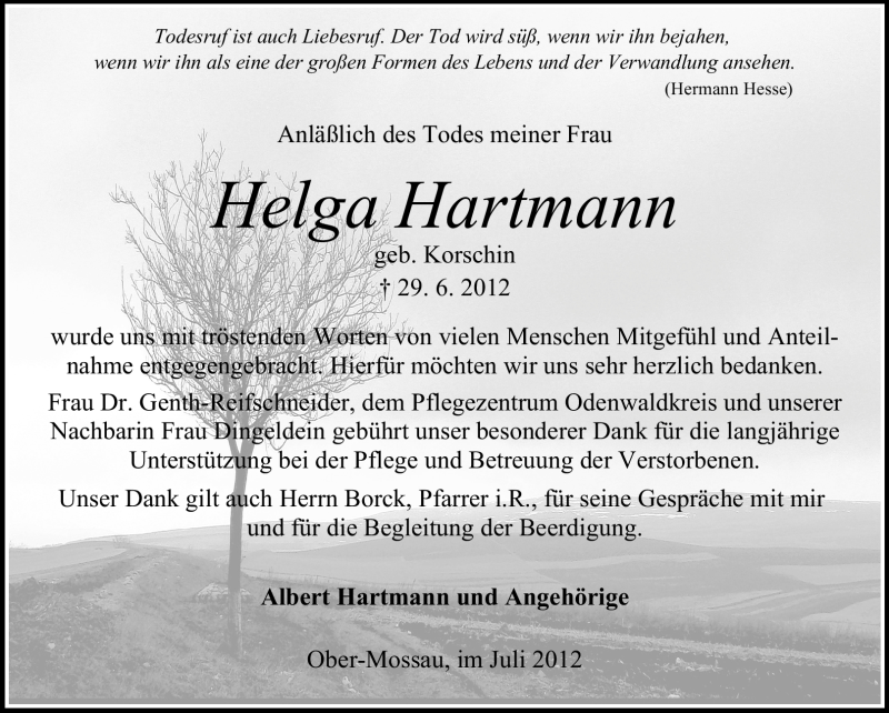 Hier finden Sie alle Traueranzeigen aus der Zeitung, die bisher für Helga Hartmann erschienen sind. Weitere Traueranzeigen, die in der Zeitung erscheinen, werden hier ebenfalls aufgelistet