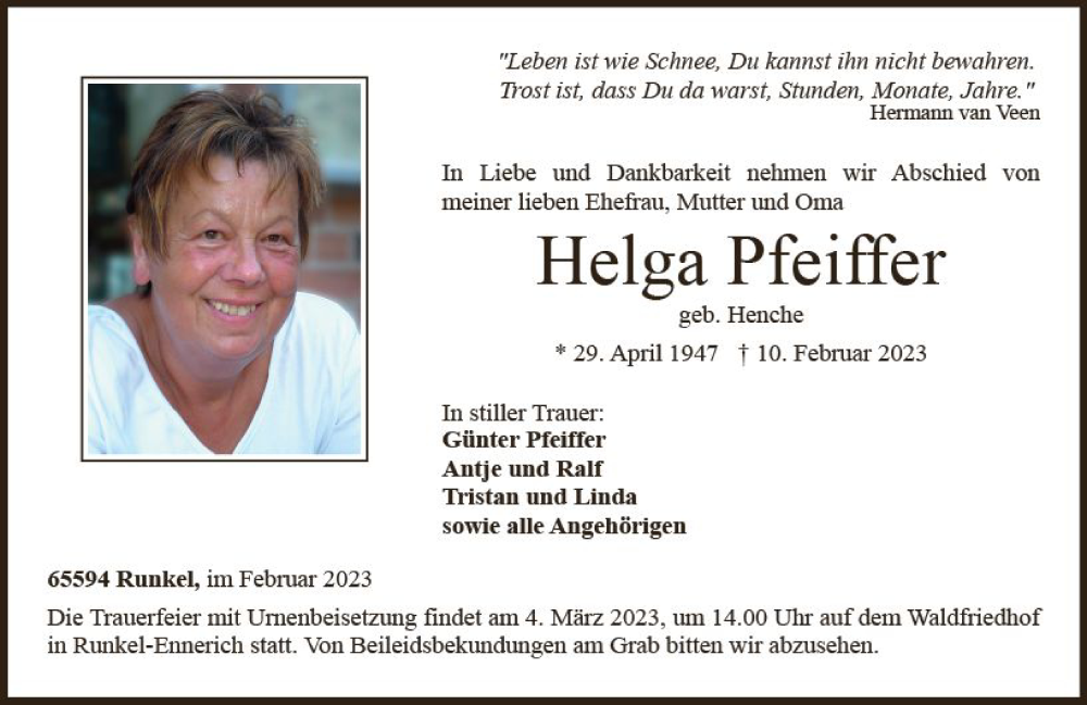 Hier finden Sie alle Traueranzeigen aus der Zeitung, die bisher für Helga Pfeiffer erschienen sind. Weitere Traueranzeigen, die in der Zeitung erscheinen, werden hier ebenfalls aufgelistet