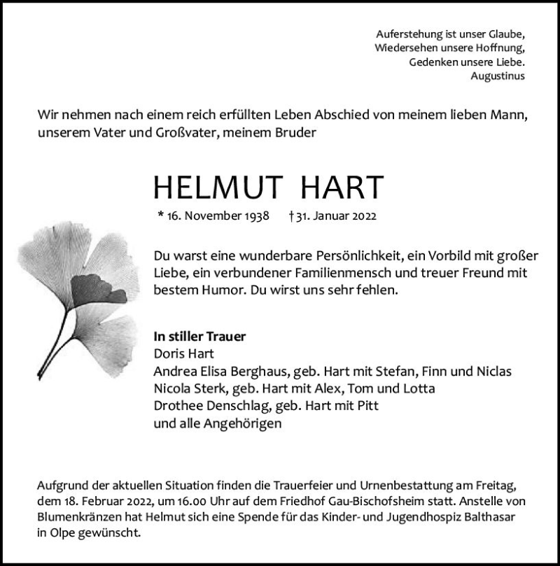 Hier finden Sie alle Traueranzeigen aus der Zeitung, die bisher für Helmut Hart erschienen sind. Weitere Traueranzeigen, die in der Zeitung erscheinen, werden hier ebenfalls aufgelistet