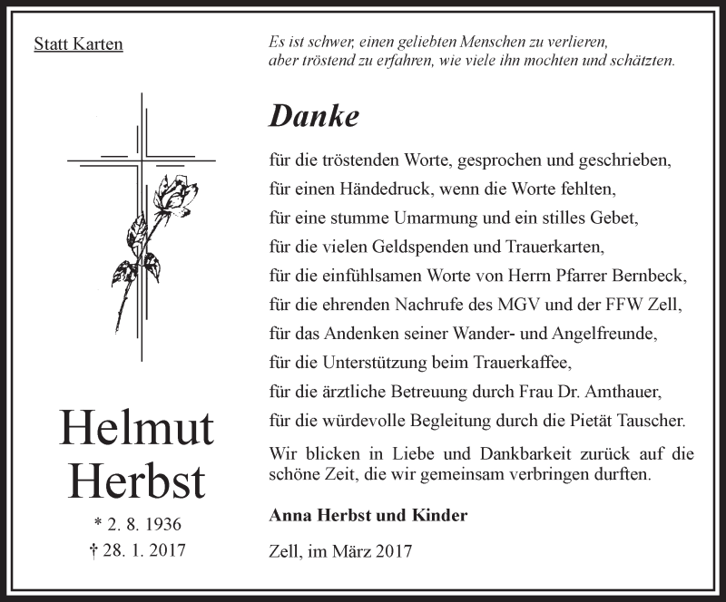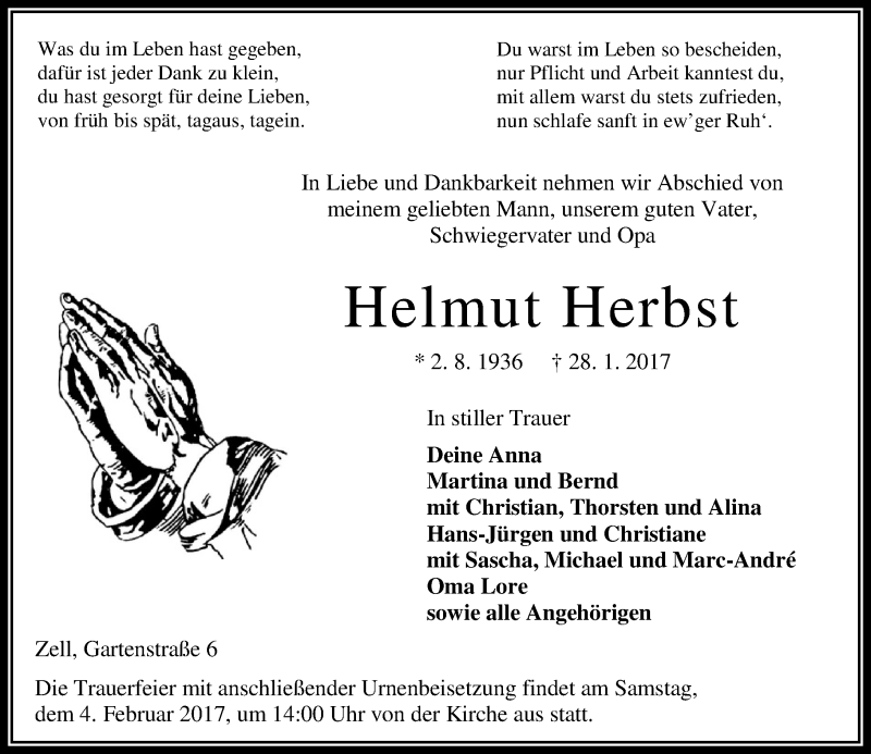 Hier finden Sie alle Traueranzeigen aus der Zeitung, die bisher für Helmut Herbst erschienen sind. Weitere Traueranzeigen, die in der Zeitung erscheinen, werden hier ebenfalls aufgelistet