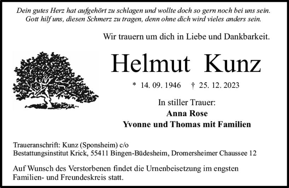 Hier finden Sie alle Traueranzeigen aus der Zeitung, die bisher für Helmut Kunz erschienen sind. Weitere Traueranzeigen, die in der Zeitung erscheinen, werden hier ebenfalls aufgelistet