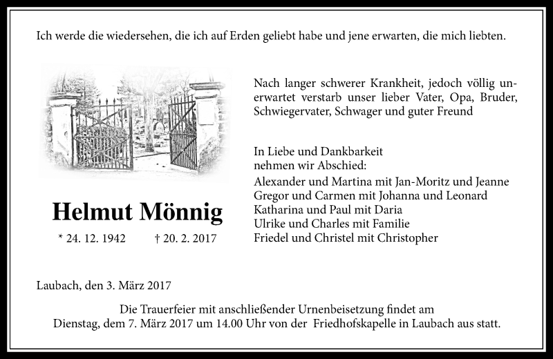 Hier finden Sie alle Traueranzeigen aus der Zeitung, die bisher für Helmut Mönnig erschienen sind. Weitere Traueranzeigen, die in der Zeitung erscheinen, werden hier ebenfalls aufgelistet