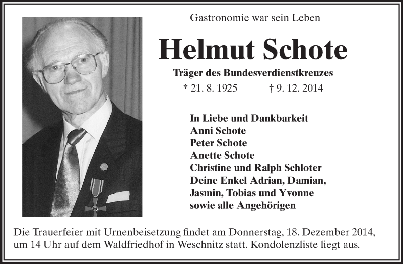 Hier finden Sie alle Traueranzeigen aus der Zeitung, die bisher für Helmut Schote erschienen sind. Weitere Traueranzeigen, die in der Zeitung erscheinen, werden hier ebenfalls aufgelistet