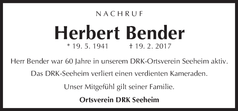 Hier finden Sie alle Traueranzeigen aus der Zeitung, die bisher für Herbert Bender erschienen sind. Weitere Traueranzeigen, die in der Zeitung erscheinen, werden hier ebenfalls aufgelistet