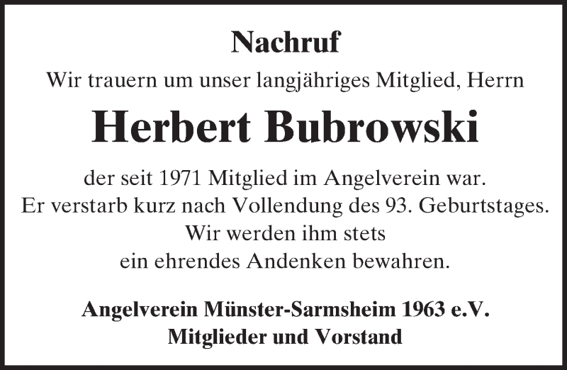 Hier finden Sie alle Traueranzeigen aus der Zeitung, die bisher für Herbert Bubrowski erschienen sind. Weitere Traueranzeigen, die in der Zeitung erscheinen, werden hier ebenfalls aufgelistet
