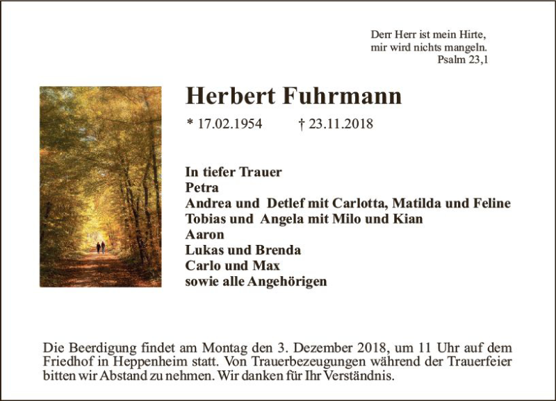 Hier finden Sie alle Traueranzeigen aus der Zeitung, die bisher für Herbert Fuhrmann erschienen sind. Weitere Traueranzeigen, die in der Zeitung erscheinen, werden hier ebenfalls aufgelistet