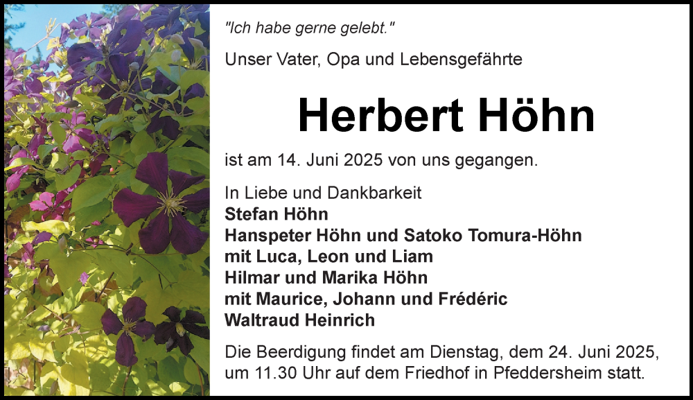Hier finden Sie alle Traueranzeigen aus der Zeitung, die bisher für Herbert Höhn erschienen sind. Weitere Traueranzeigen, die in der Zeitung erscheinen, werden hier ebenfalls aufgelistet