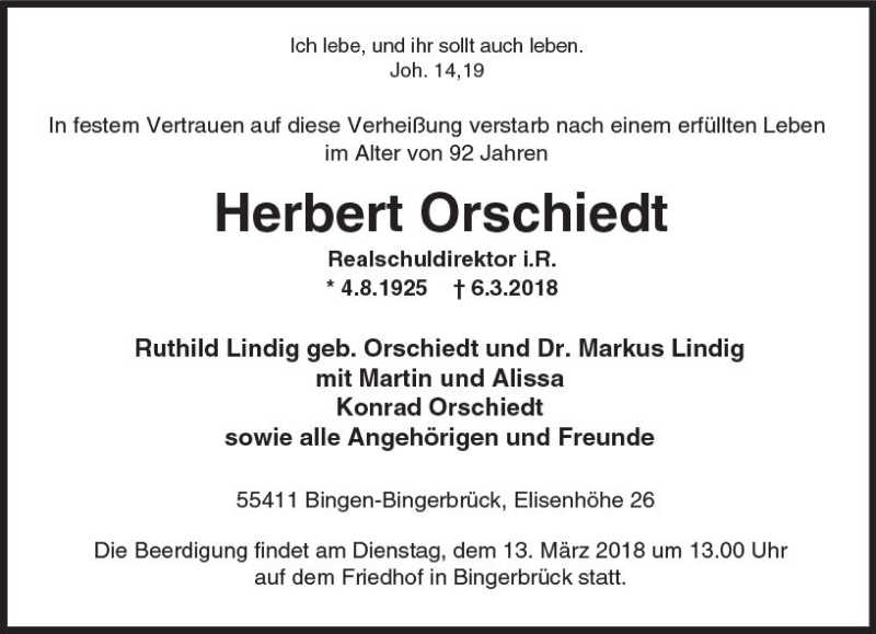 Hier finden Sie alle Traueranzeigen aus der Zeitung, die bisher für Herbert Orschiedt erschienen sind. Weitere Traueranzeigen, die in der Zeitung erscheinen, werden hier ebenfalls aufgelistet