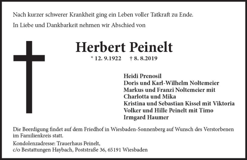 Hier finden Sie alle Traueranzeigen aus der Zeitung, die bisher für Herbert Peinelt erschienen sind. Weitere Traueranzeigen, die in der Zeitung erscheinen, werden hier ebenfalls aufgelistet