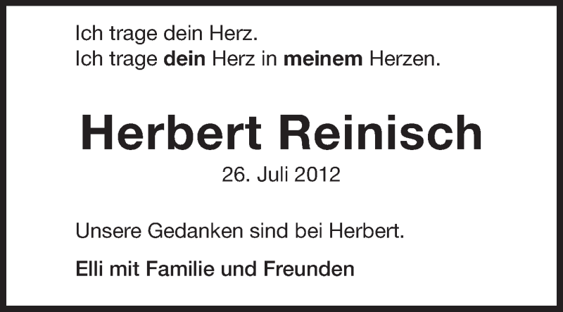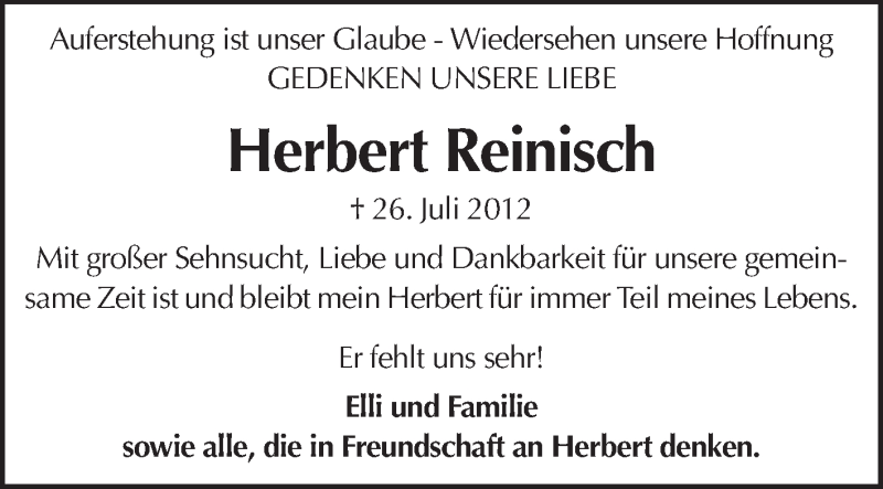Hier finden Sie alle Traueranzeigen aus der Zeitung, die bisher für Herbert Reinisch erschienen sind. Weitere Traueranzeigen, die in der Zeitung erscheinen, werden hier ebenfalls aufgelistet