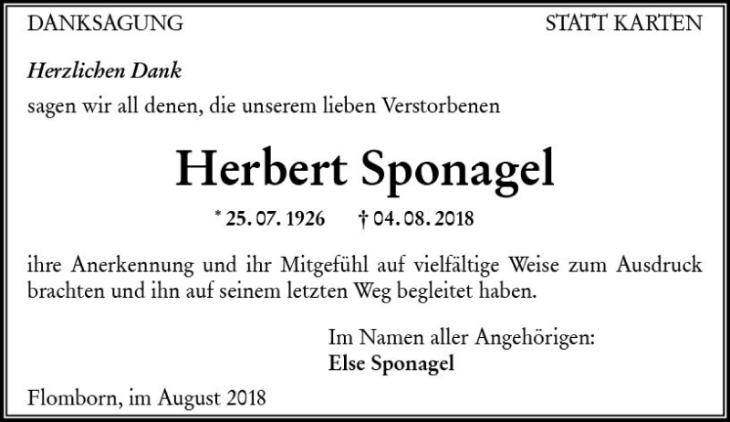 Hier finden Sie alle Traueranzeigen aus der Zeitung, die bisher für Herbert Sponagel erschienen sind. Weitere Traueranzeigen, die in der Zeitung erscheinen, werden hier ebenfalls aufgelistet