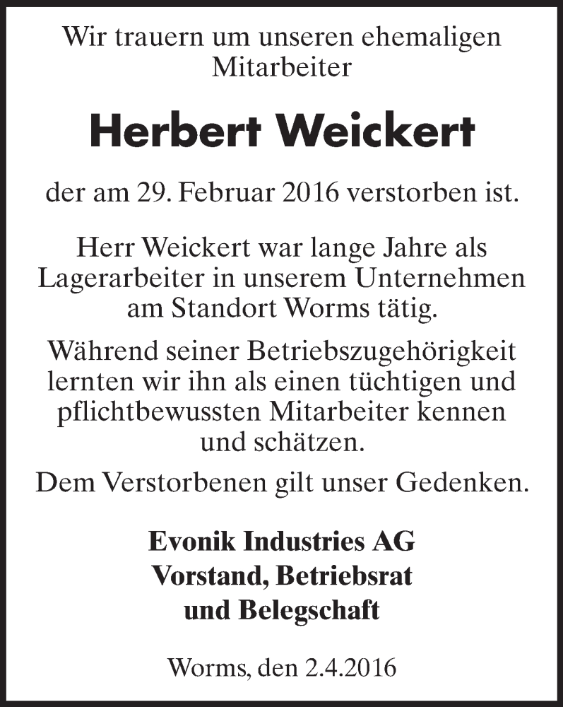 Hier finden Sie alle Traueranzeigen aus der Zeitung, die bisher für Herbert Weickert erschienen sind. Weitere Traueranzeigen, die in der Zeitung erscheinen, werden hier ebenfalls aufgelistet