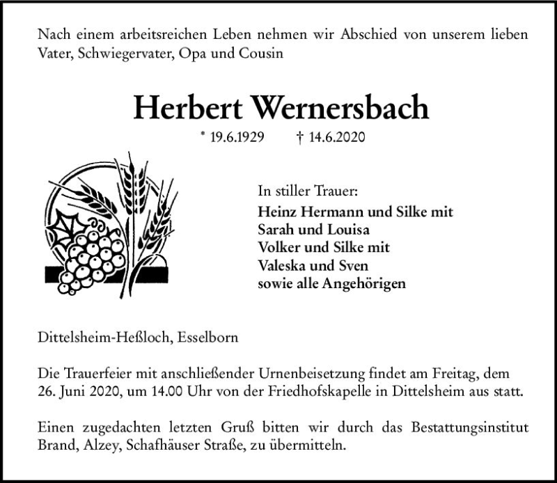 Hier finden Sie alle Traueranzeigen aus der Zeitung, die bisher für Herbert Wernersbach erschienen sind. Weitere Traueranzeigen, die in der Zeitung erscheinen, werden hier ebenfalls aufgelistet