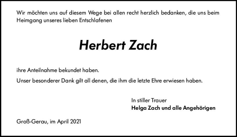 Hier finden Sie alle Traueranzeigen aus der Zeitung, die bisher für Herbert Zach erschienen sind. Weitere Traueranzeigen, die in der Zeitung erscheinen, werden hier ebenfalls aufgelistet