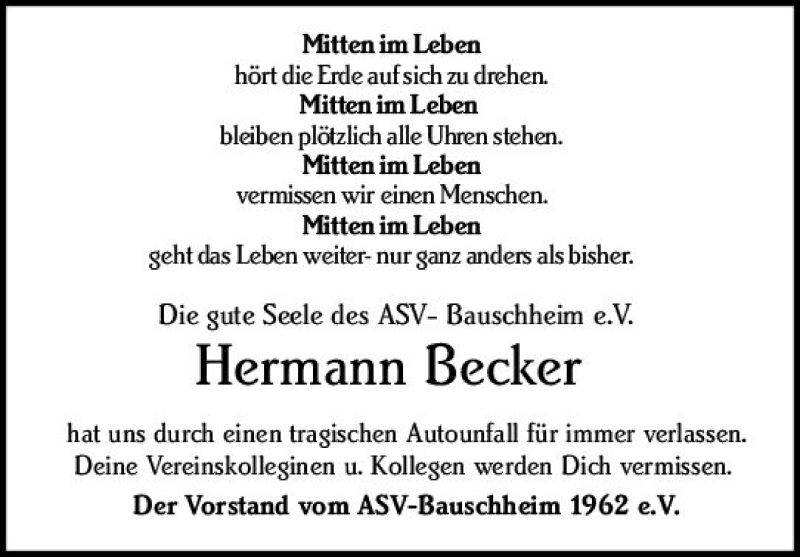Hier finden Sie alle Traueranzeigen aus der Zeitung, die bisher für Hermann Becker erschienen sind. Weitere Traueranzeigen, die in der Zeitung erscheinen, werden hier ebenfalls aufgelistet