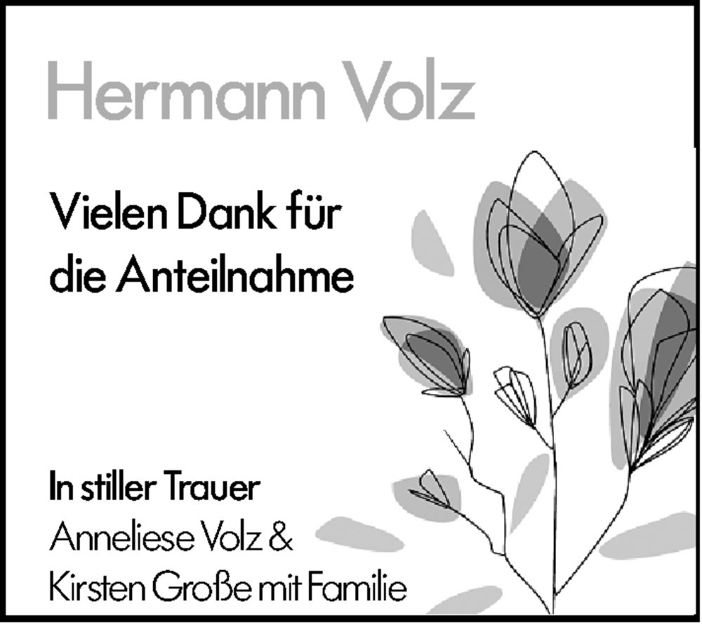 Hier finden Sie alle Traueranzeigen aus der Zeitung, die bisher für Hermann Volz erschienen sind. Weitere Traueranzeigen, die in der Zeitung erscheinen, werden hier ebenfalls aufgelistet