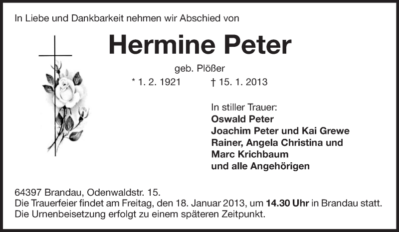 Hier finden Sie alle Traueranzeigen aus der Zeitung, die bisher für Hermine Peter erschienen sind. Weitere Traueranzeigen, die in der Zeitung erscheinen, werden hier ebenfalls aufgelistet