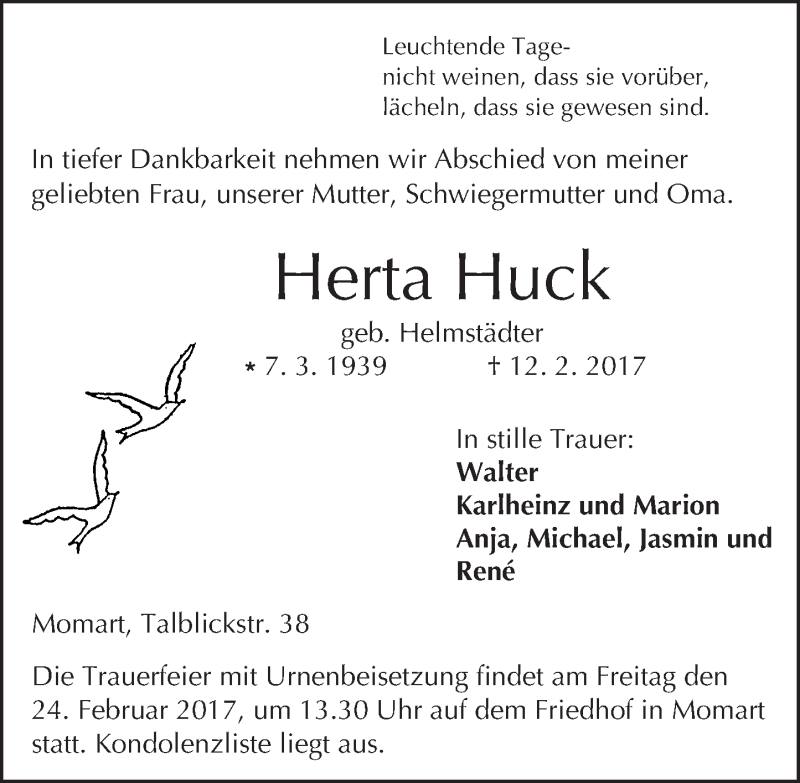 Hier finden Sie alle Traueranzeigen aus der Zeitung, die bisher für Herta Huck erschienen sind. Weitere Traueranzeigen, die in der Zeitung erscheinen, werden hier ebenfalls aufgelistet