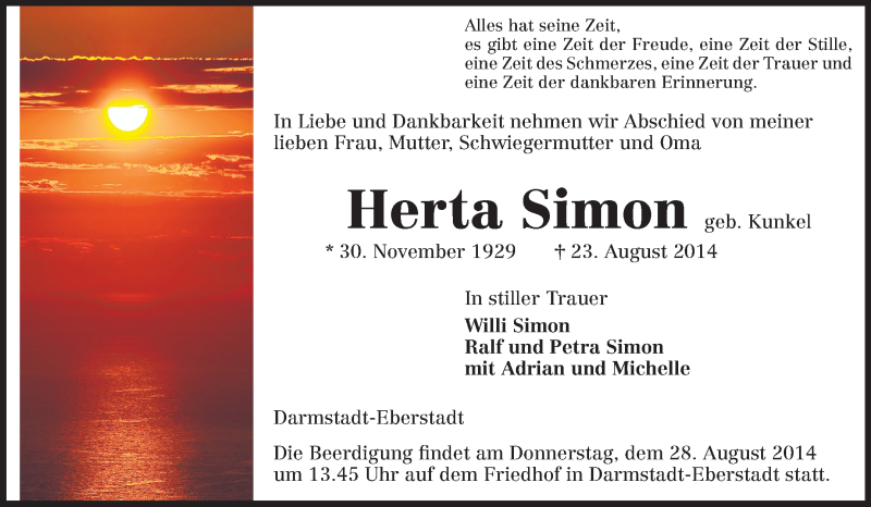 Hier finden Sie alle Traueranzeigen aus der Zeitung, die bisher für Herta Simon erschienen sind. Weitere Traueranzeigen, die in der Zeitung erscheinen, werden hier ebenfalls aufgelistet