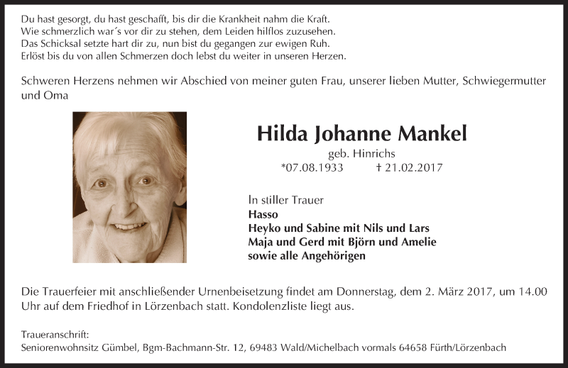 Hier finden Sie alle Traueranzeigen aus der Zeitung, die bisher für Hilda Johanne Mankel erschienen sind. Weitere Traueranzeigen, die in der Zeitung erscheinen, werden hier ebenfalls aufgelistet