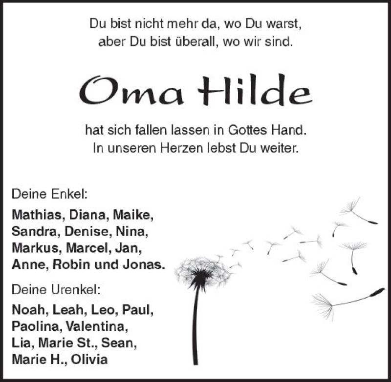 Hier finden Sie alle Traueranzeigen aus der Zeitung, die bisher für Hilde erschienen sind. Weitere Traueranzeigen, die in der Zeitung erscheinen, werden hier ebenfalls aufgelistet
