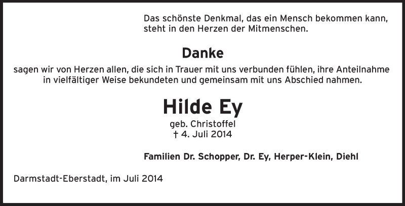 Hier finden Sie alle Traueranzeigen aus der Zeitung, die bisher für Hilde Ey erschienen sind. Weitere Traueranzeigen, die in der Zeitung erscheinen, werden hier ebenfalls aufgelistet