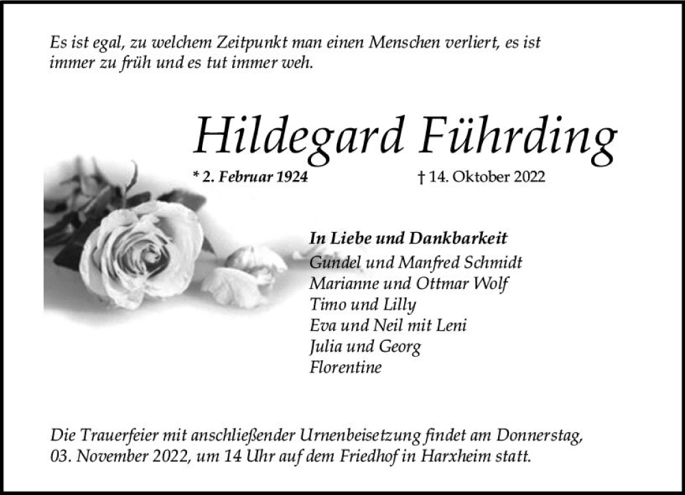 Hier finden Sie alle Traueranzeigen aus der Zeitung, die bisher für Hildegard Führding erschienen sind. Weitere Traueranzeigen, die in der Zeitung erscheinen, werden hier ebenfalls aufgelistet