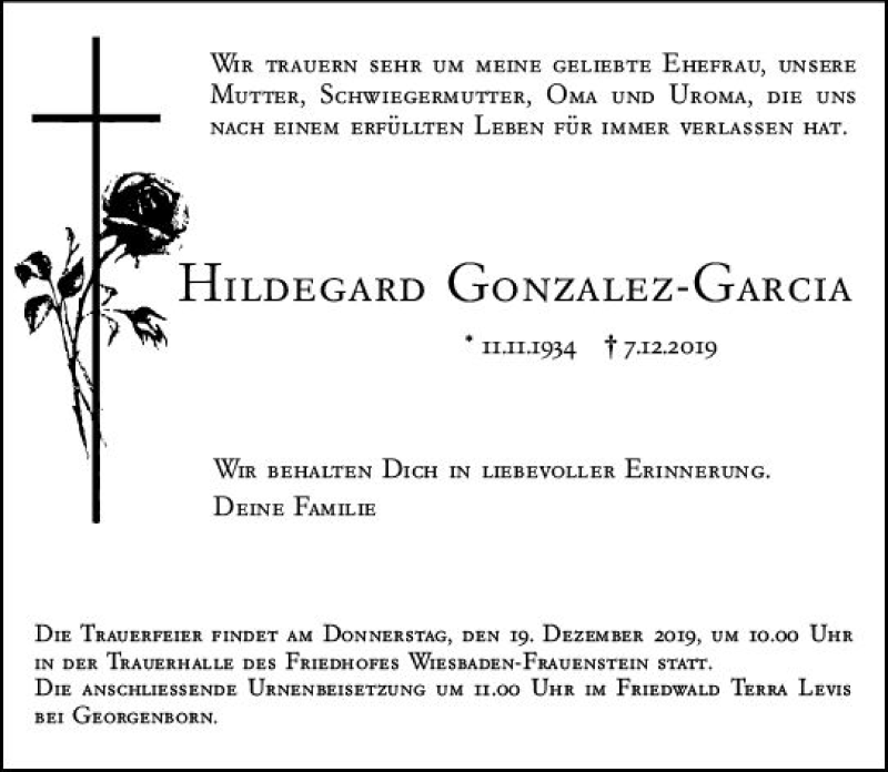 Hier finden Sie alle Traueranzeigen aus der Zeitung, die bisher für Hildegard Gonzalez-Garcia erschienen sind. Weitere Traueranzeigen, die in der Zeitung erscheinen, werden hier ebenfalls aufgelistet